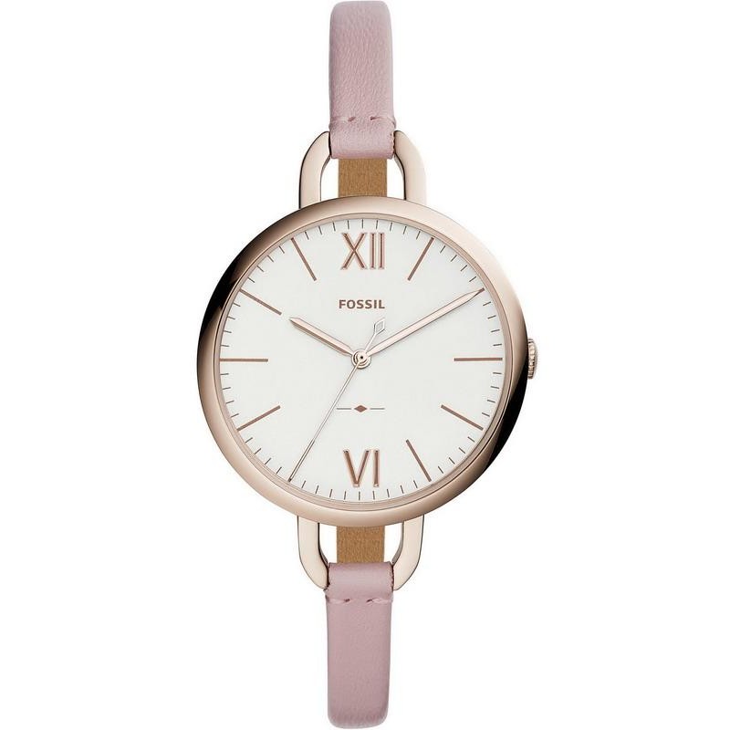 Brand: Fossil; Collection: Annette; Article Code: ES4356; Type of product: Wristwatch; Gender: Woman; Functions: Just Time; Type of Movement / Mechanism: Quartz / Battery; Case Shape: Round; Case Material: Stainless Steel; Case Color: Rose Gold; Case Diameter Ø: 36 mm; Type of Dial: Analog; Color of the Dial: White; Strap Material: Leather; Strap Color: Pink; Water Resistance: 30 meters / 3 bar.